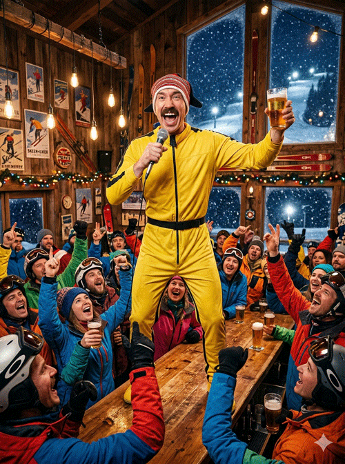 Det fulle pakka. Ekte norsk afterski-stemning med allsang, quiz, DJ og spontane innslag – alt i ett. Opplegget bygges